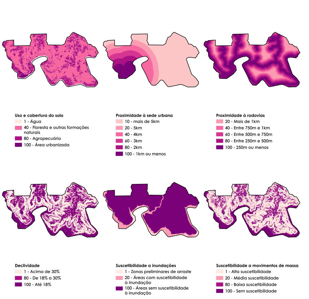 Methodology: Application of a multicriteria analysis that involved modeling, normalization, and weighting of factors (slope, flood risk, landslides, and infrastructure) to identify a map with four levels of urban suitability, considering climate change.